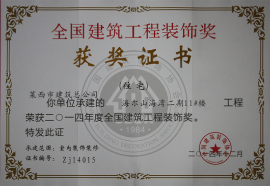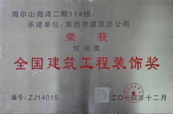 海爾山海灣二期11#樓工程榮獲2014年度全國(guó)建筑工程裝飾獎(jiǎng)
