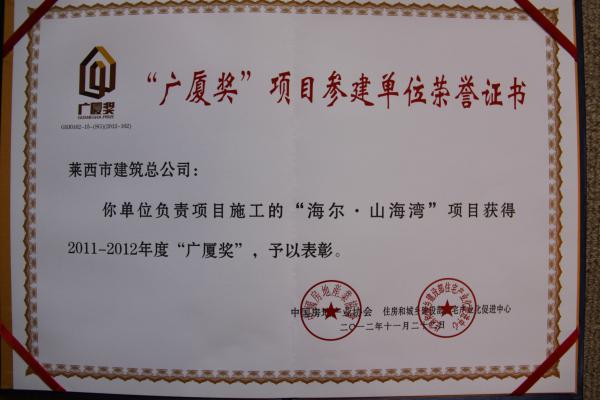 11月22日中國(guó)房地產(chǎn)協(xié)會(huì)2011-2012年度“廣廈獎(jiǎng)”頒獎(jiǎng)大會(huì)在北京舉行。我公司施工的“海爾·山海灣”工程獲此榮譽(yù)。