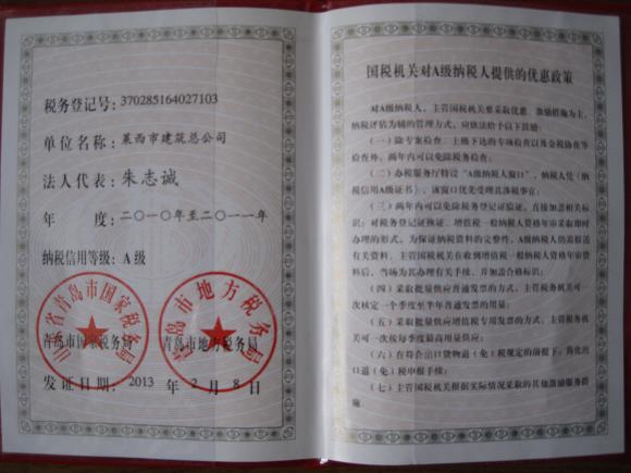2013年4月17日,萊西市國家稅務(wù)局、萊西市地方稅務(wù)局領(lǐng)導(dǎo)一行6人,專程到我公司頒發(fā)了青島市國家稅務(wù)局、青島市地方稅務(wù)局《A級納稅信用等級單位》牌匾和證書,這是我公司第二次獲此殊榮。