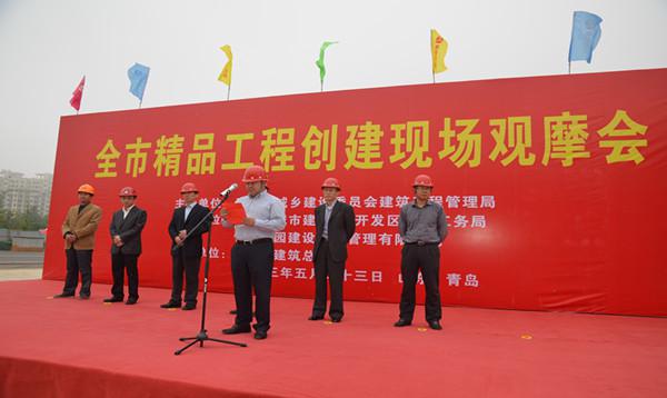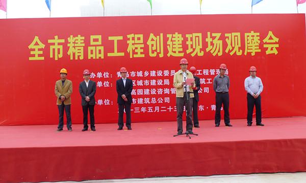 5月23日上午,青島市精品工程創(chuàng)建現(xiàn)場(chǎng)觀摩會(huì)在我公司欒健項(xiàng)目部施工的全民健身中心工程順利召開。青島市建管局副局長孫維珉、市質(zhì)監(jiān)站站長劉昕光、開發(fā)區(qū)建設(shè)局副局長王海建、開發(fā)區(qū)建筑工務(wù)局副局長王建、我公司董事長孫涌分別在觀摩會(huì)上發(fā)表講話。