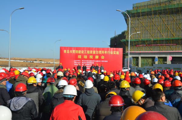 12月5日上午,青島市貫徹建設(shè)工程質(zhì)量治理兩年行動實(shí)施現(xiàn)場觀摩會在我公司王慎平項(xiàng)目部承建的德國企業(yè)中心項(xiàng)目召開。青島市建管局質(zhì)量監(jiān)督站總工程師崔浩、黃島區(qū)城市建設(shè)局副局長薛旻傳、我公司董事長孫涌同志分別進(jìn)行了經(jīng)驗(yàn)介紹和總結(jié)發(fā)言,來自青島市四市七區(qū)的九百余家建設(shè)、施工、監(jiān)理單位,三千余名有關(guān)負(fù)責(zé)人對德國企業(yè)中心項(xiàng)目工程實(shí)體展示區(qū)、建設(shè)工程質(zhì)量治理兩年行動展板展示區(qū)、新技術(shù)及新材料應(yīng)用展示區(qū)、工藝樣板展示區(qū)、綠色施工展示區(qū)等分別進(jìn)行了觀摩。參會人員對德國企業(yè)中心項(xiàng)目工程質(zhì)量、常見質(zhì)量問題的治理、樣板領(lǐng)路的作法、綠色施工等給予了高度評價。