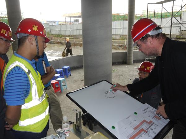 2015年9月2日,被動(dòng)房施工培訓(xùn)活動(dòng)在中德生態(tài)園項(xiàng)目舉辦。該活動(dòng)由德國專家瓦倫廷先生(德國設(shè)計(jì)團(tuán)隊(duì)ROA負(fù)責(zé)人)對(duì)被動(dòng)屋施工技術(shù)進(jìn)行現(xiàn)場授課。我公司及相關(guān)參建單位參加了此次培訓(xùn)。