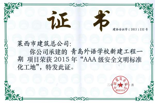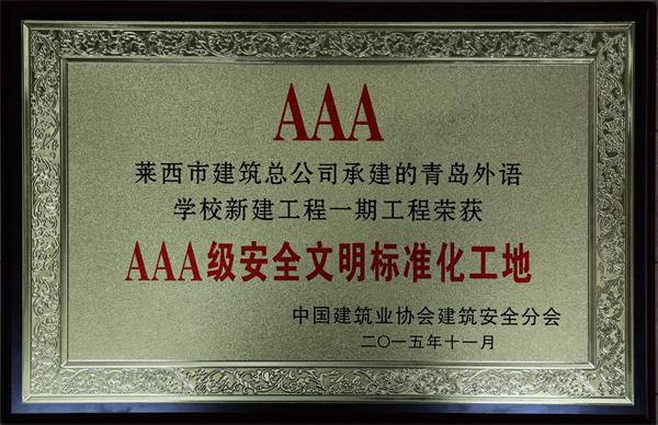 青島外語學校工程榮獲2015年“AAA級安全文明標準化工地”