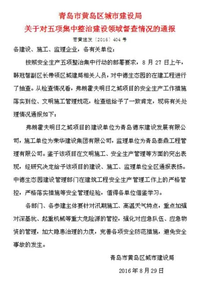 弗朗霍夫明日之城項(xiàng)目 受到黃島區(qū)城市建設(shè)局通報(bào)表揚(yáng)
