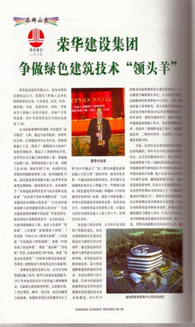 中共山東省委黨校主管的《山東經(jīng)濟(jì)研究》(總第九十五期)期刊在“品牌山東”專欄以“榮華建設(shè)集團(tuán)爭(zhēng)做綠色建筑技術(shù)‘領(lǐng)頭羊’”為題刊發(fā)文章,詳細(xì)介紹了集團(tuán)公司在技術(shù)研發(fā)、科技創(chuàng)新、綠色施工以及低能耗建筑等方面的先進(jìn)成果,并指出“榮華建設(shè)集團(tuán)正借助開放包容的國(guó)際化合作優(yōu)勢(shì)以及中德兩國(guó)專家資源,依托自身科技進(jìn)步和技術(shù)創(chuàng)新,實(shí)現(xiàn)被動(dòng)式低能耗建筑與建筑工業(yè)化、住宅工業(yè)化有機(jī)結(jié)合,推動(dòng)建立中國(guó)的被動(dòng)式建筑和技術(shù)規(guī)范”,引起廣泛關(guān)注。《青島日?qǐng)?bào)》在《青島建筑業(yè)優(yōu)秀科技創(chuàng)新企業(yè)巡禮》專欄也刊登了該文章,《鳳凰財(cái)經(jīng)》、《山東光明網(wǎng)》等多家網(wǎng)絡(luò)媒體紛紛轉(zhuǎn)載。