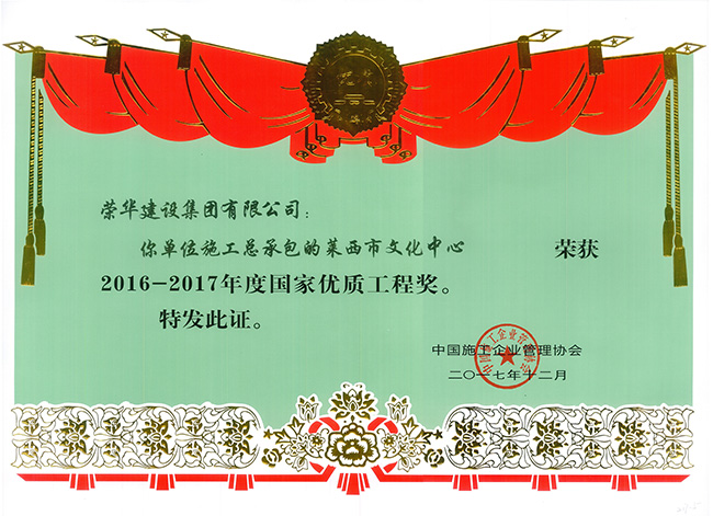 大會(huì)對(duì)獲得2016-2017年度國(guó)家優(yōu)質(zhì)工程獎(jiǎng)、2016年度中國(guó)施工企業(yè)管理協(xié)會(huì)科學(xué)技術(shù)獎(jiǎng)的獲獎(jiǎng)企業(yè)和先進(jìn)個(gè)人進(jìn)行了表彰。由我集團(tuán)公司承建的萊西市文化中心工程榮獲“國(guó)家優(yōu)質(zhì)工程獎(jiǎng)”。七公司總經(jīng)理吳克祥同志代表集團(tuán)公司參加會(huì)議并上臺(tái)領(lǐng)獎(jiǎng)。