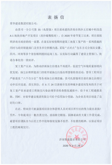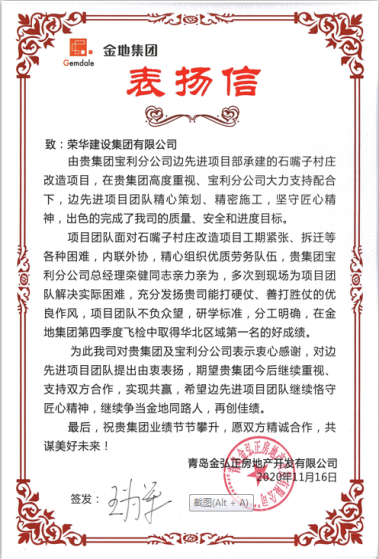 近日,集團(tuán)總部收到青島金弘正房地產(chǎn)開(kāi)發(fā)有限公司發(fā)來(lái)的表?yè)P(yáng)信,對(duì)寶利公司邊先進(jìn)項(xiàng)目部承建的石嘴子村莊改造項(xiàng)目提出表?yè)P(yáng)。