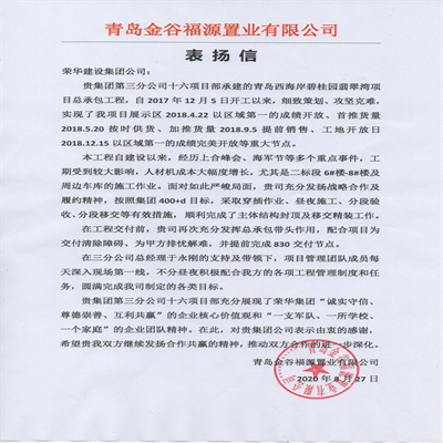 近日,集團(tuán)總部收到青島金谷福源置業(yè)有限公司發(fā)來的表揚(yáng)信,對三公司十六(王慎平)項(xiàng)目部施工的青島西海岸碧桂園翡翠灣項(xiàng)目總承包工程提出表揚(yáng)。
