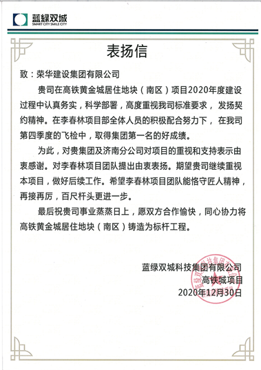 近期,集團(tuán)總部收到藍(lán)綠雙城科技集團(tuán)有限公司發(fā)來(lái)的表?yè)P(yáng)信,對(duì)濟(jì)南公司第三十九(李春林)項(xiàng)目部施工的高鐵黃金城居住地塊(南區(qū))提出表?yè)P(yáng)。