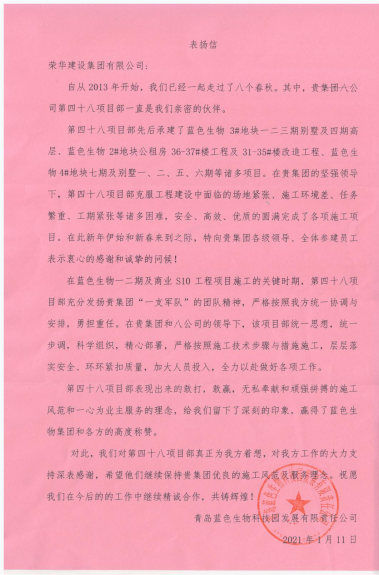 近日,集團(tuán)總部收到青島藍(lán)色生物科技園發(fā)展有限責(zé)任公司發(fā)來的表揚信,對八公司第四十八(郝中華)項目部施工的藍(lán)色生物3#地塊一二三期別墅及四期高層、藍(lán)色生物2#地塊公租房36-37#樓工程及31-35#樓改造工程、藍(lán)色生物4#地塊7期及別墅一、二、五、六期等諸多項目提出表揚。
