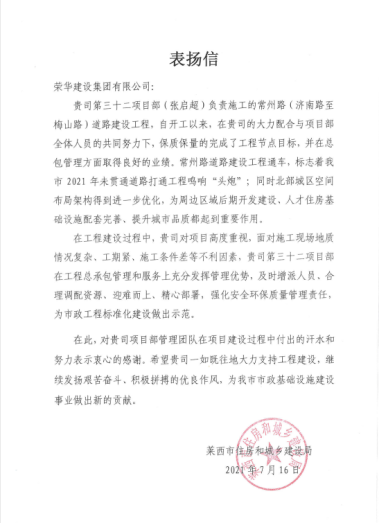 近期,集團(tuán)總部收到萊西市住房和城鄉(xiāng)建設(shè)局發(fā)來的表揚(yáng)信,對張啟超項目部負(fù)責(zé)施工的常州路(濟(jì)南路至梅山路)道路建設(shè)工程提出表揚(yáng)。