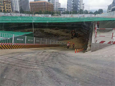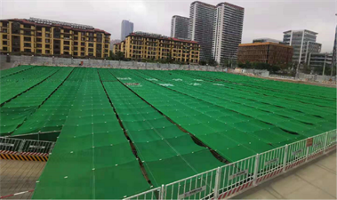 青島國際院士港設(shè)計研發(fā)中心項目自開工以來,項目部認(rèn)真貫徹建筑工地?fù)P塵治理有關(guān)文件精神,嚴(yán)格落實省、市建筑工地?fù)P塵治理措施和要求,結(jié)合工程周邊環(huán)境復(fù)雜、作業(yè)周期長、易揚塵、工序多等特點,大膽進(jìn)行技術(shù)研發(fā)創(chuàng)新,成功采用了大跨度全自動“天幕”系統(tǒng)。該項目采用的“天幕”系統(tǒng)兼具防塵、降噪、遮陽、降溫等功能,由支撐鋼結(jié)構(gòu)系統(tǒng)、傳動系統(tǒng)、開合系統(tǒng)、陣列噴淋系統(tǒng)、LED照明系統(tǒng)、動力及照明電力系統(tǒng)等六個子系統(tǒng)構(gòu)成,采取遠(yuǎn)程遙控控制,可實現(xiàn)展開或收縮?!疤炷弧睂⒄麄€基坑完全覆蓋,確保全部施工作業(yè)均在“天幕”下進(jìn)行,有效實現(xiàn)了對基坑范圍內(nèi)土方全覆蓋,最大限度地降低了土方作業(yè)期間揚塵污染問題,有效降低了細(xì)顆粒物濃度,全面提高了揚塵治理精細(xì)化管理水平。