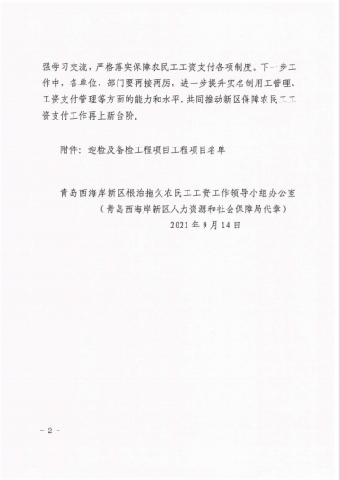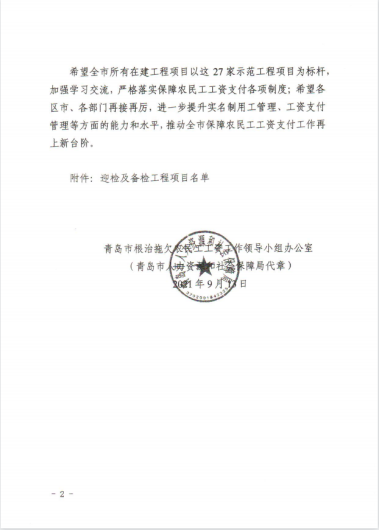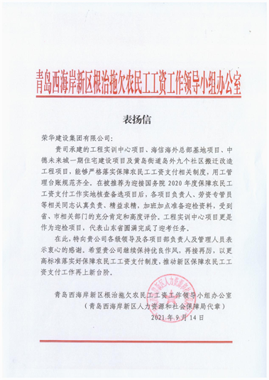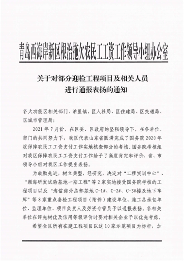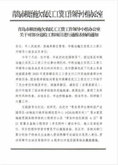 近期,集團公司總部收到來自青島市、西海岸新區(qū)兩級根治拖欠農(nóng)民工工資工作領(lǐng)導(dǎo)小組辦公室發(fā)來的通報表揚。對集團公司承建的山東科技大學(xué)工程實訓(xùn)中心項目、海信海外總部基地項目、中德未來城一期住宅建設(shè)項目、黃島街道島外九個社區(qū)搬遷改造工程、平度市新舊動能轉(zhuǎn)換產(chǎn)業(yè)園建設(shè)項目(一期)中小企業(yè)產(chǎn)業(yè)園1.1-1.3期項目、海信.鳳臺世家、青島萊西市人才公寓建設(shè)項目、東城時代項目等8個工程提出表揚。