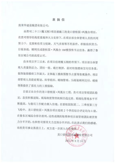 近日,集團公司收到龍口碧桂園西城置業(yè)有限公司發(fā)來的表揚信,對七公司魏玉剛項目部施工的龍口碧桂園?鳳凰臺項目提出表揚。