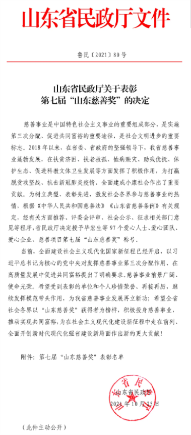 近日,中華慈善總會(huì)、山東省民政廳先后發(fā)布表彰決定,集團(tuán)公司董事長(zhǎng)孫涌同志被中華慈善總會(huì)授予“愛(ài)心企業(yè)家”,集團(tuán)公司被山東省民政廳授予第七屆“山東慈善獎(jiǎng)”。