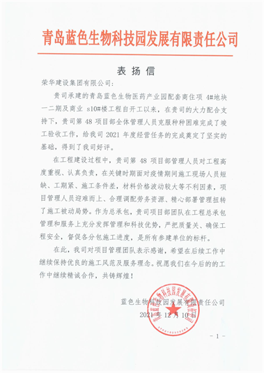 近日,集團公司收到藍色生物科技園發(fā)展有限責(zé)任公司發(fā)來的表揚信,對八公司郝忠華項目部施工的青島藍色生物醫(yī)藥產(chǎn)業(yè)園配套商住項目4#地塊一、二期及商業(yè)s10#樓工程提出表揚。