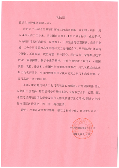 近日,集團(tuán)公司收到青島龍華盛錦置業(yè)有限公司發(fā)來的表揚(yáng)信,對二公司馬呈陽項(xiàng)目部施工的龍湖商街(碩陽路)一期1、4組團(tuán)項(xiàng)目提出表揚(yáng)。