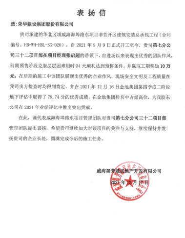 近日,集團(tuán)公司收到威海墨芳城房地產(chǎn)開發(fā)有限公司發(fā)來的表揚信,對七公司張啟超項目部施工的金地威海海埠路東項目非首開區(qū)建筑安裝總承包工程提出表揚。