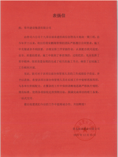 近日,集團公司收到青島海誠置業(yè)有限公司發(fā)來的表揚信,對六公司第十九項目部施工的海信創(chuàng)智島D地塊一期工程提出表揚。