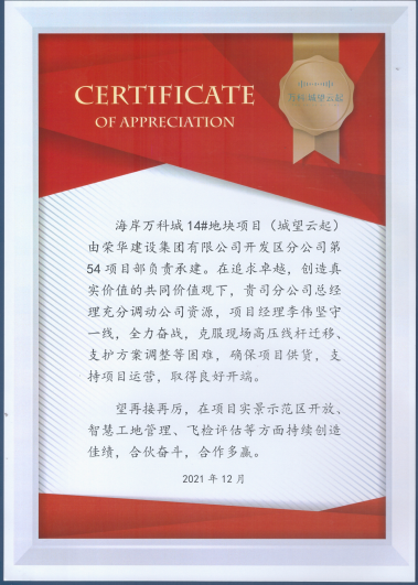 近日,集團(tuán)公司收到萬(wàn)科城望云起項(xiàng)目部發(fā)來(lái)的表?yè)P(yáng)信,對(duì)開(kāi)發(fā)區(qū)公司李偉項(xiàng)目部施工的海岸萬(wàn)科城14#地塊項(xiàng)目提出表?yè)P(yáng)。