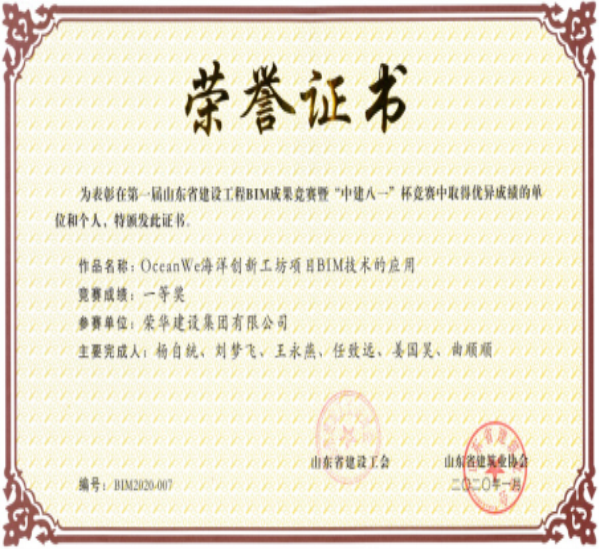 集團公司《OceanWe海洋創(chuàng)新工坊項目BIM技術(shù)應(yīng)用》,榮獲山東省建設(shè)工會、山東省建筑業(yè)協(xié)會舉辦的第一屆山東省建設(shè)工程BIM成果競賽暨“中建八一”杯競賽一等獎。