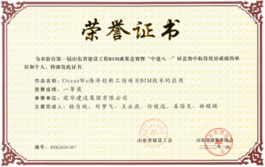 集團BIM中心主編完成的《OceanWe海洋創(chuàng)新工坊項目BIM技術應用》經(jīng)市建筑業(yè)協(xié)會審核、推薦,經(jīng)專家評審、公開答辯和競賽組委會會議審定,最終榮獲此次競賽綜合組一等獎。